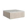 The Carmen Cocktail Table, a striking blend of natural beauty and modern design, features a sleek stone top and a distinctive base with a textured, indented design. Its smooth top provides a perfect surface for entertaining, while the casters allow for easy mobility, making it a versatile piece for any room.